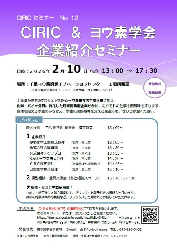 対象:就職を検討する学生(B3以上)、卒業生および教職員(ヨウ素学会の会員には別途電子メールにてご案内します)。企業の方も参加できます。